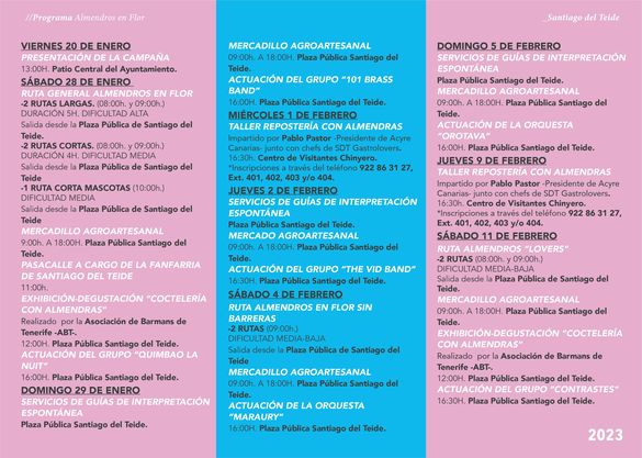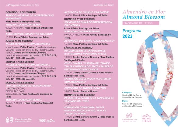 Les mostramos la programación de actos integrada en la nueva edición de la Campaña del Almendro en Flor de Santiago del Teide 2023, que se desarrollará del 28 de enero al 26 de febrero y que integrará todo un despliegue de actividades ligadas al mágico espectáculo natural que nos brinda la floración de nuestros almendros. 🌸